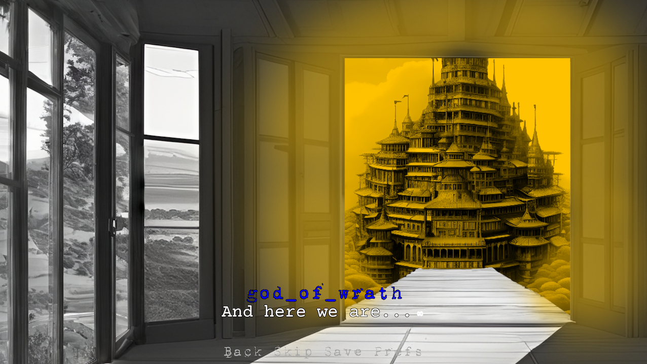 It is also a part of school projects (yes, hence the Addendum #1) to leverage GenAI for storytelling. The story text and interface/cinematic design are entirely human-made. Only the visuals and some sounds are from AI (Stable Diffusion mainly). Though the visuals have usually been heavily edited after generation (e.g., for coherence). This also means that I DO NOT OWN THE VISUALS/SOUNDS entirely, but I do consider myself owning the story (e.g., writing, game logic, and cinematic design).